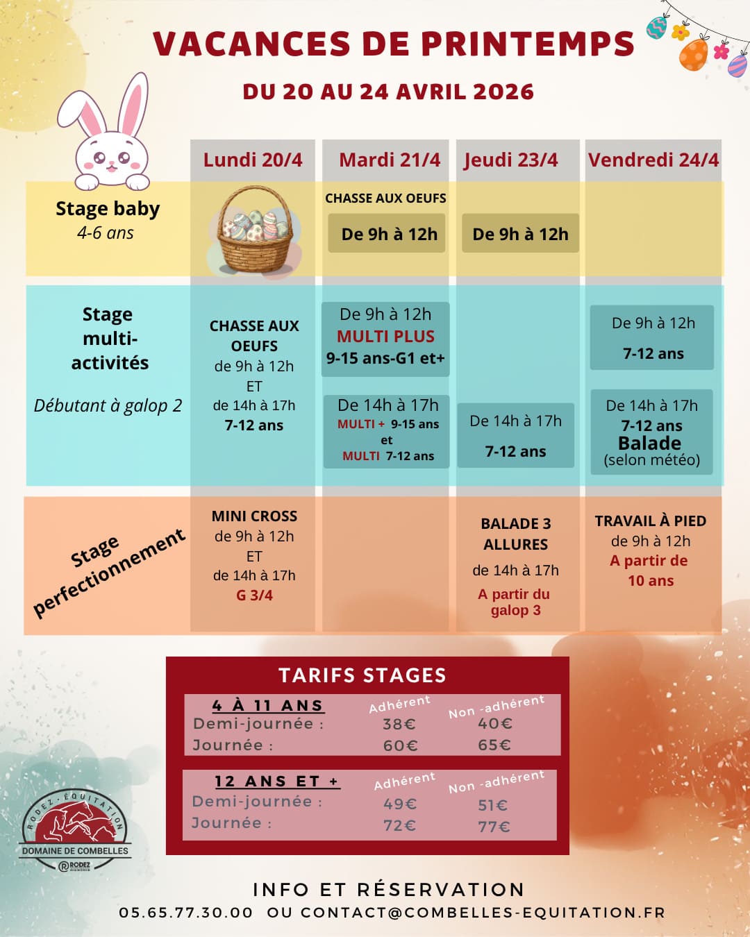 Tout au long de l’année, au cours des périodes de vacances scolaires, le Domaine de Combelles vous propose divers stages à poney ou à cheval, de tous les niveaux, dès 4 ans.